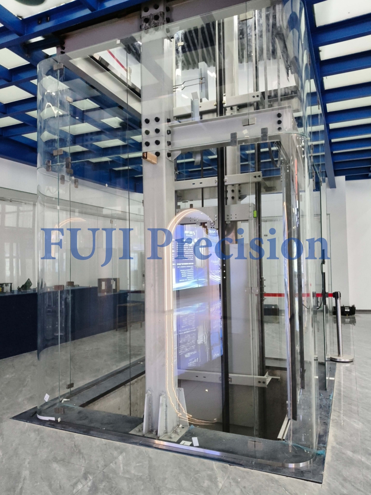 FUJI Precision presenta una solución de sala de exposición de alta gama con su ascensor panorámico de esquina con cristal curvado, diseñado para realzar la estética arquitectónica y la experiencia espacial.